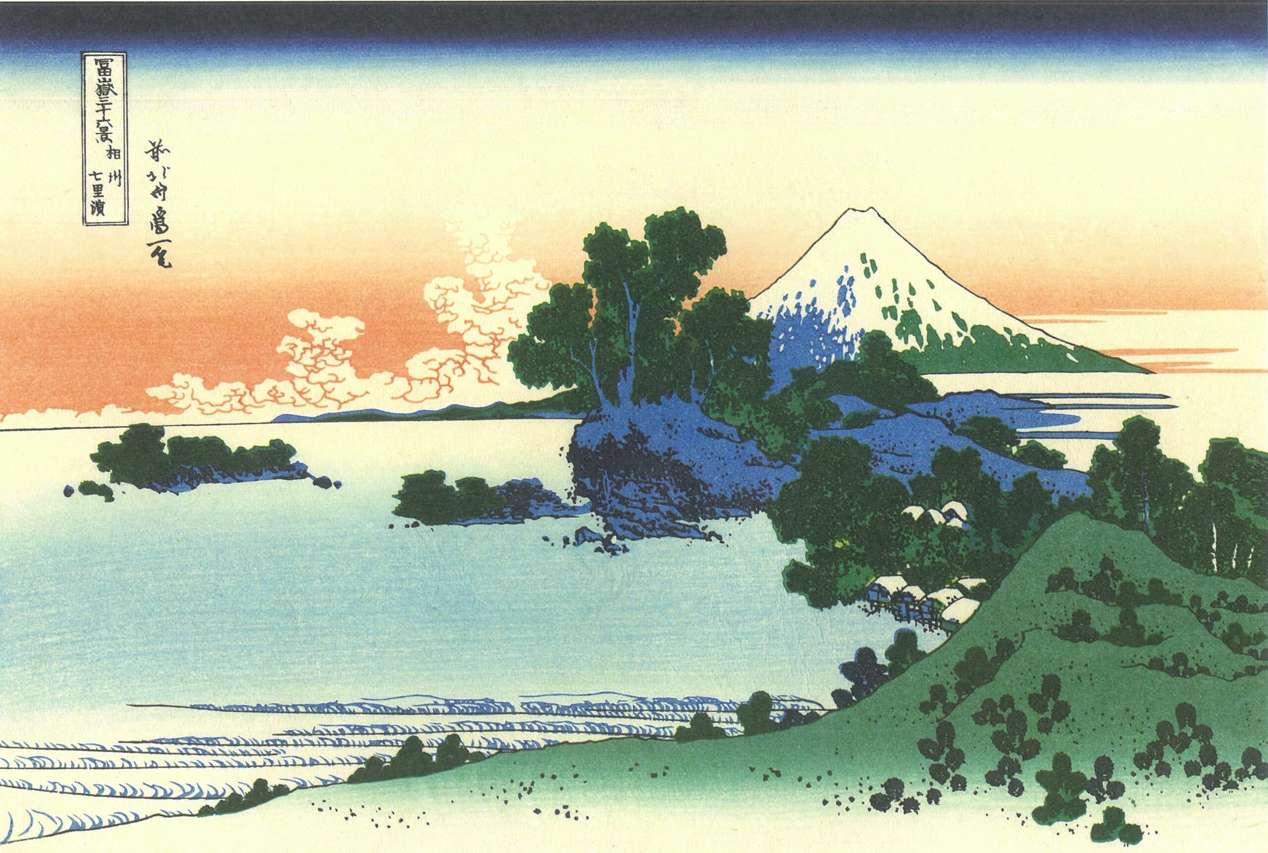 水面が白く輝いているような濃淡をつけ、実は細波も絵の具をつけないで摺られた、空摺り(色を使わず圧力で紙に凸凹をつける浮世絵の技法)で表現されている。