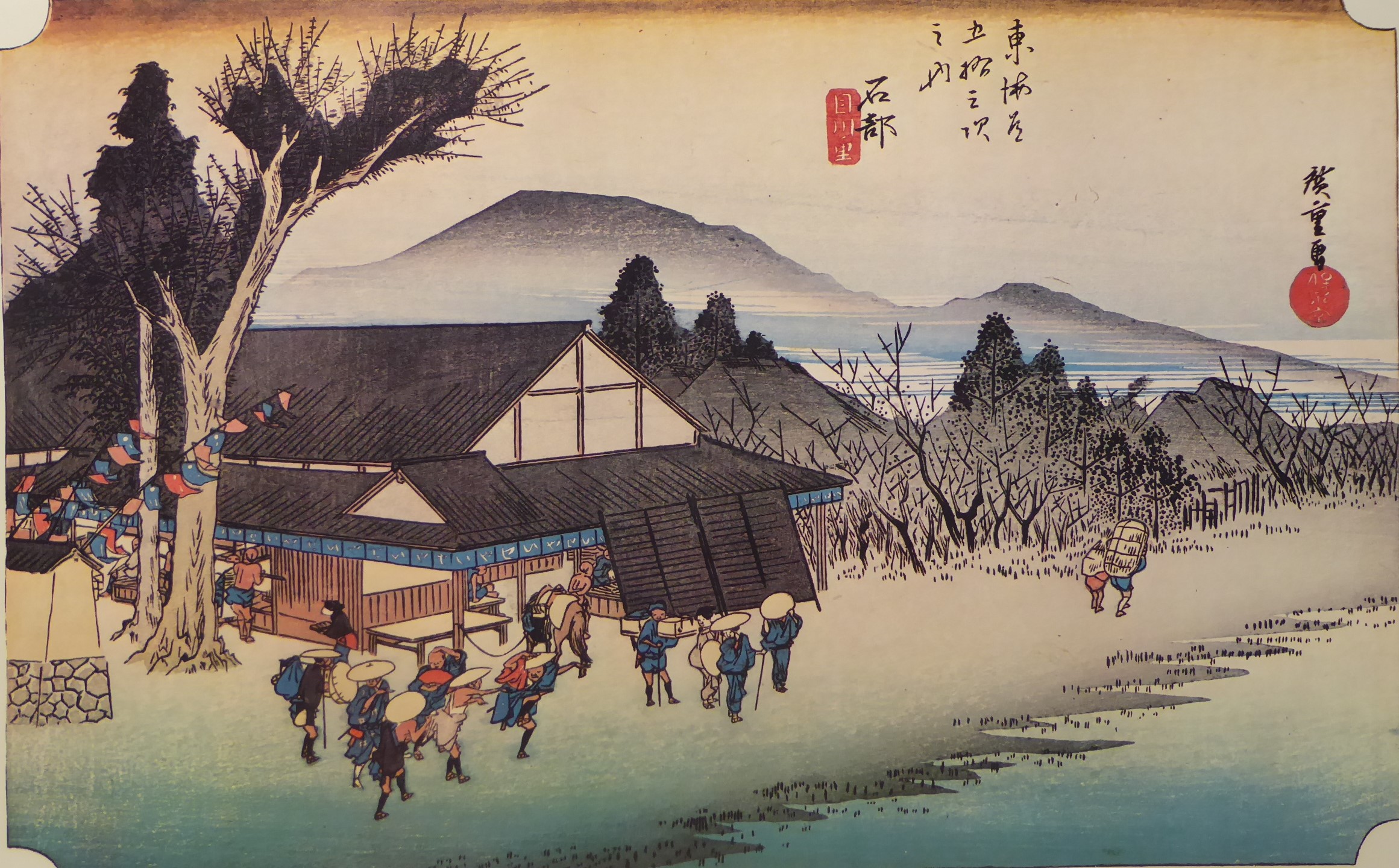 茶屋の前を横切る道がまさに東海道で、早駕籠と荷物担ぎが休む間もなく往来する様が窺えます。