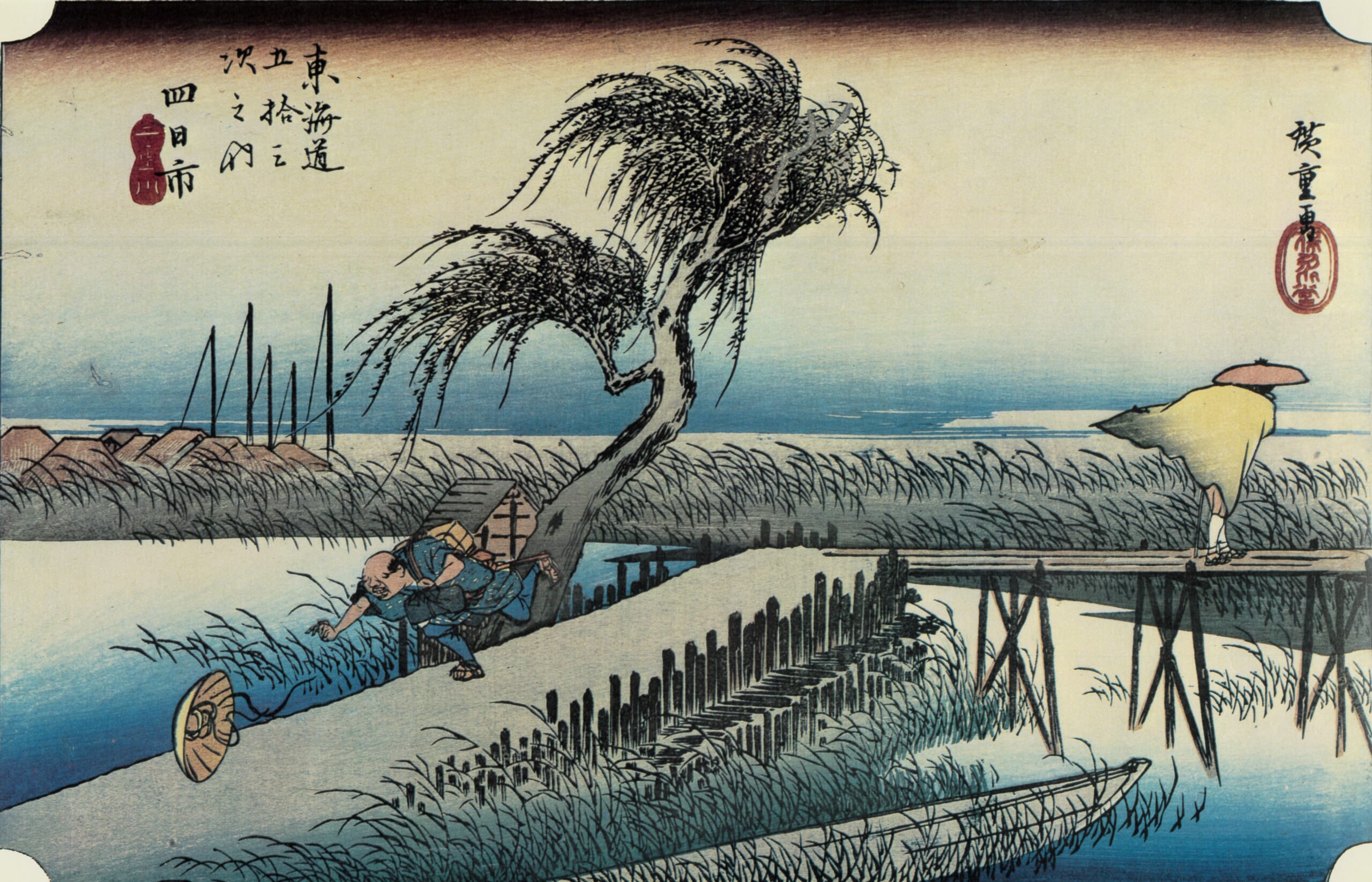 馬に乗ってゆっくりと過ぎゆく旅人たちは、これから3㎞先の庄野宿まで行って泊まるのでしょう。