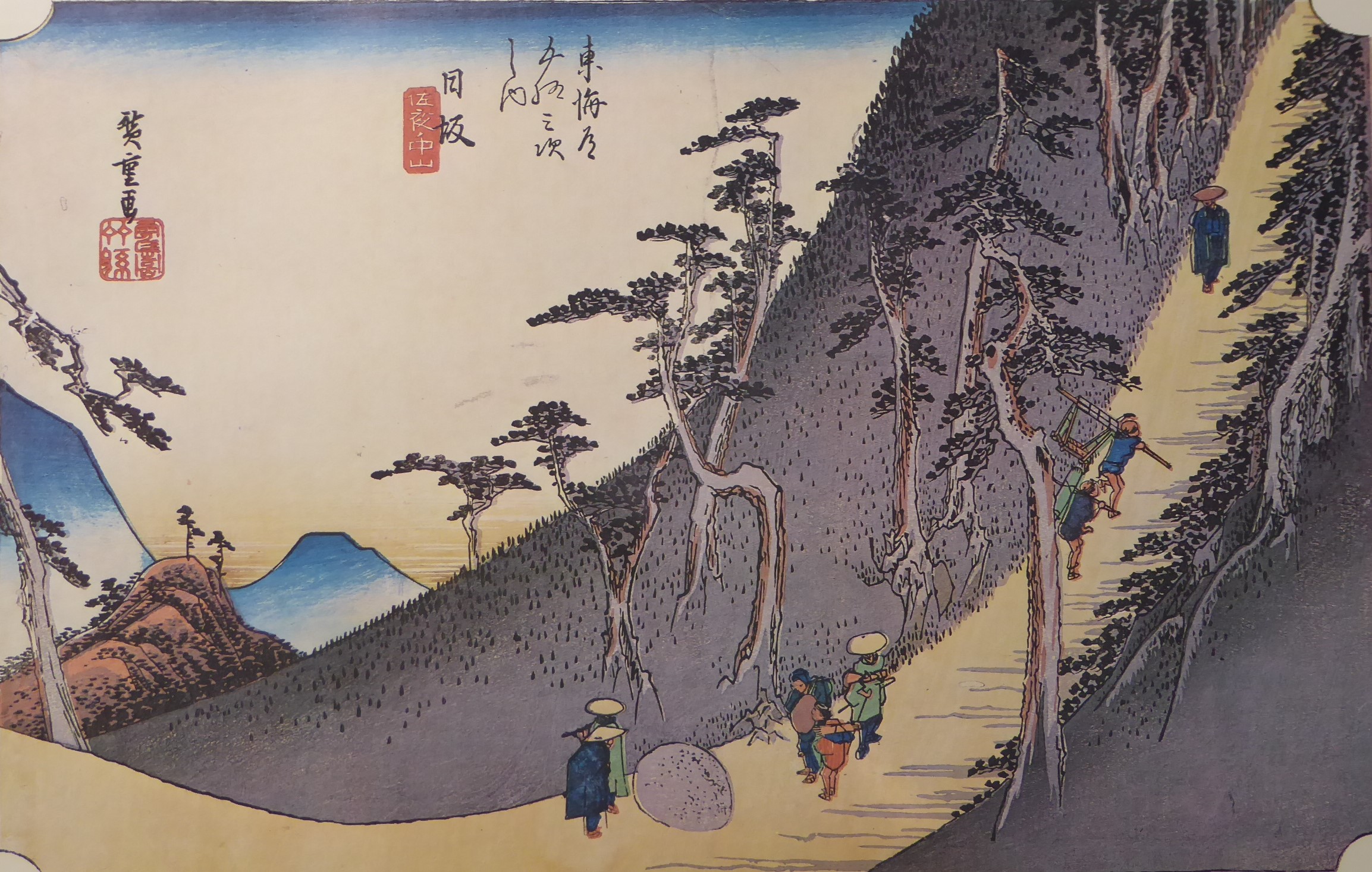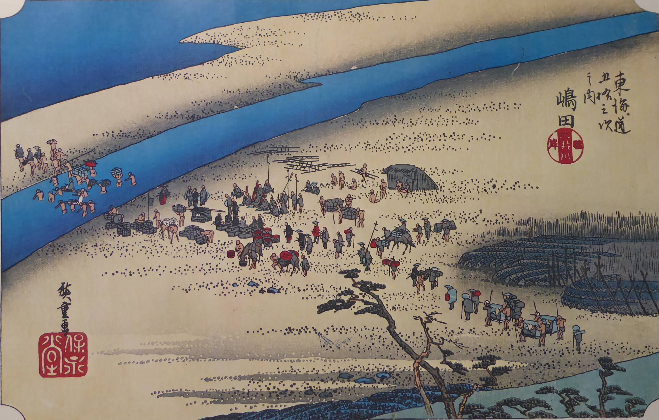 金谷宿から川越しに向かう旅人を描いています。