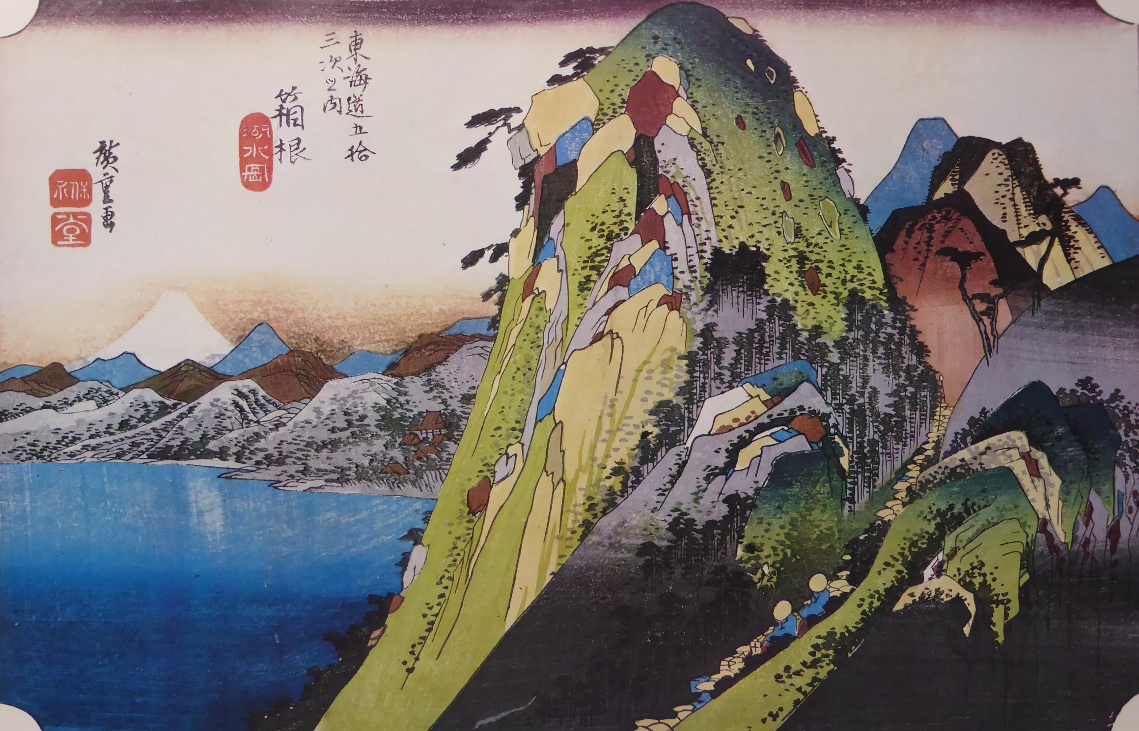 手前の駕篭の一行は三島から箱根方面へ向かっています。