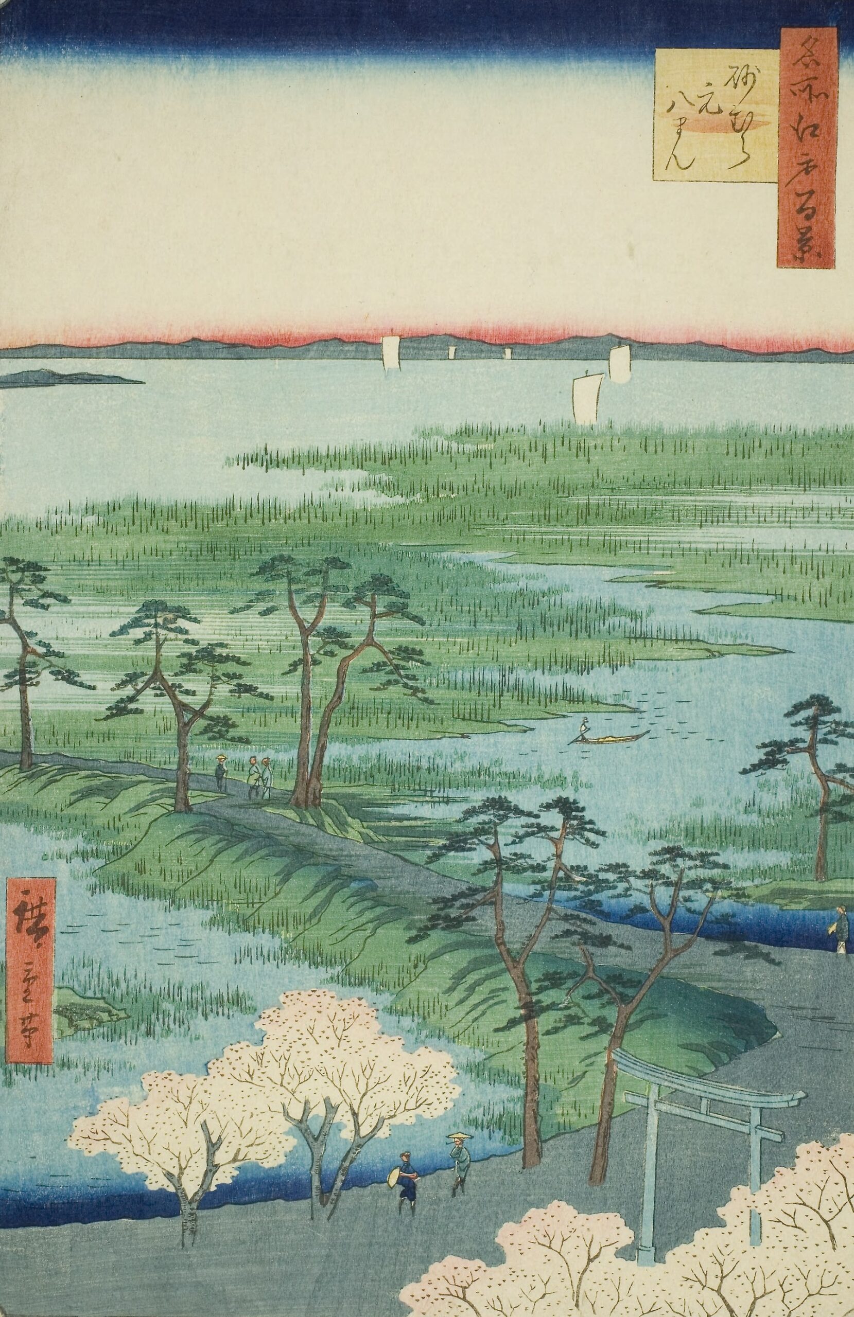 奥には梅の花を愛でる人々や茶屋の風景が見え、江戸庶民が梅を楽しむ様子が生き生きと表現されています。