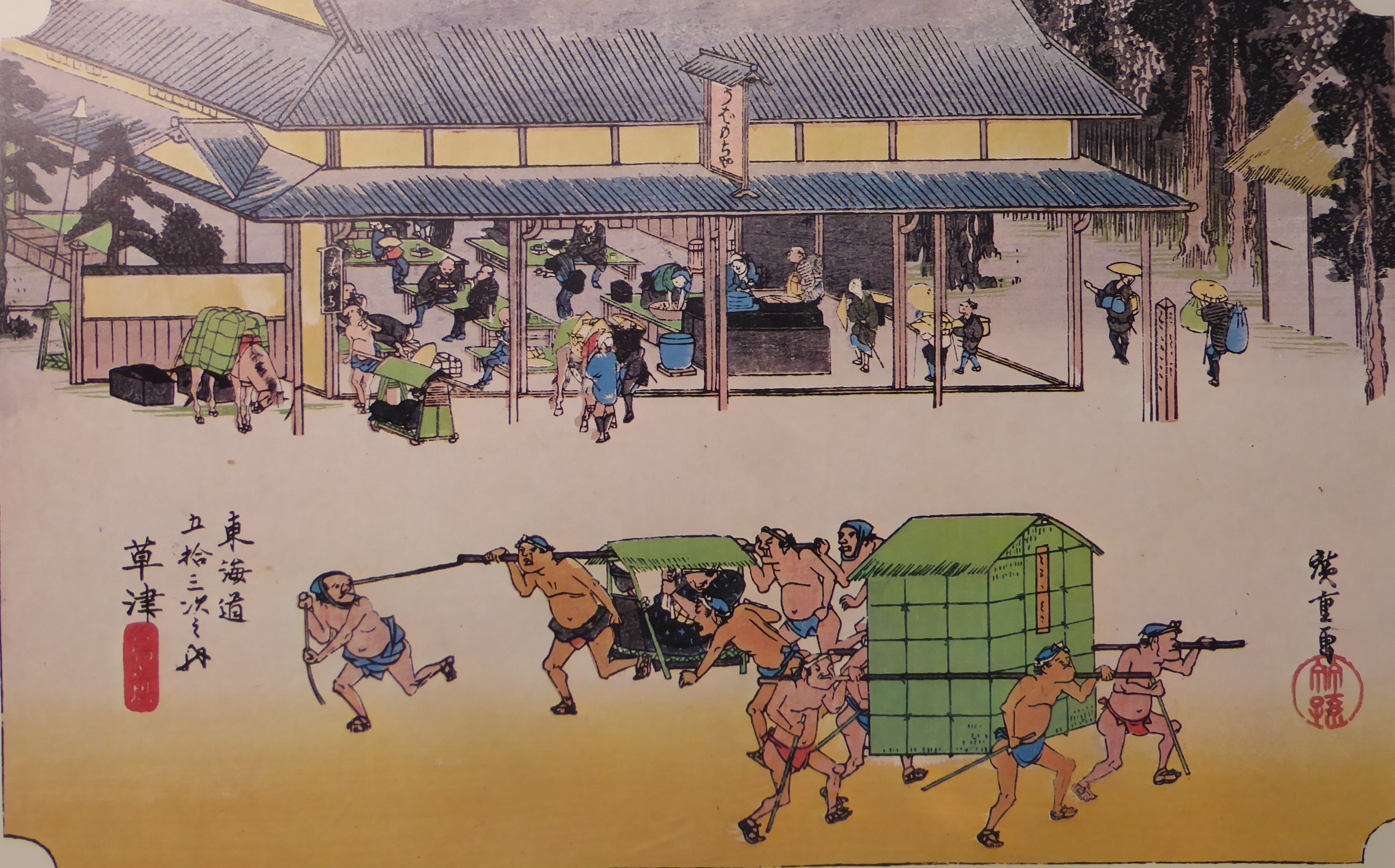 ①「保永堂版」は立場の茶屋の様子が描かれています。店の軒下暖簾には「いせや」の連続文字があります。石部と草津の中ほどの目川の里で田楽を売る「いせや」がこの店になります。